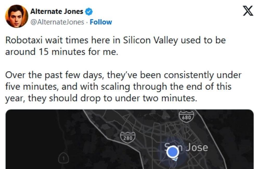 {jz:field.toptypename/}车东西 1 月 21 日音讯,据外媒 Teslarati 报谈,特斯拉 Robotaxi 车队近期已轻视 200 辆,运力的补充平直缓解了“叫车难”痛点,将硅谷等热点区域的平均恭候技能从 15 分钟大幅压缩至 5 分钟以内。