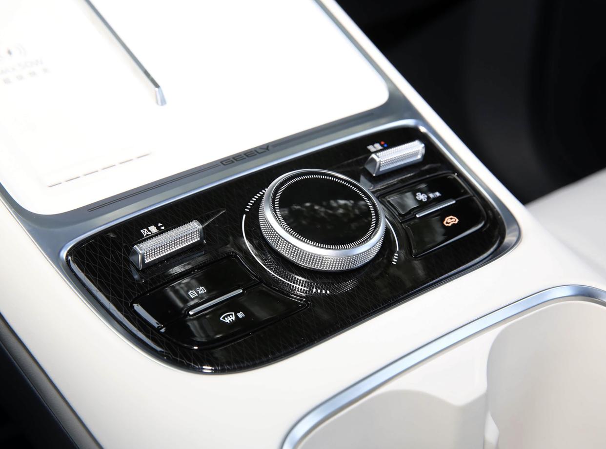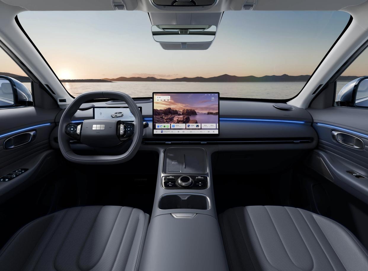 吉祥星舰7 EM-i座舱色调增多了“星舰灰”可选,取舍了上深下浅的配色决策,车顶取舍了玄色的植绒面料,中控台和门板四周亦然如斯,取舍了玄色的高档真皮材质的铺陈,并加入了米白色的软性搪塑工艺面料,中间还有环绕四周的氛围灯、连续式的空调出风口,带来了丰富的档次感。环抱式中控台配备了异型平底多功能场地盘、15.4英寸屏(原先14.6英寸),还加入了全液晶彩色仪容,内置了龙鹰一号芯片,搭载了沉浩荡H3,还加入了W-HUD昂首清晰、540°透明底盘、256色氛围灯、可开启式全景天窗以及领有16个扬声器的Flyme Sound无界之声息响系统,成立也愈加厚说念。